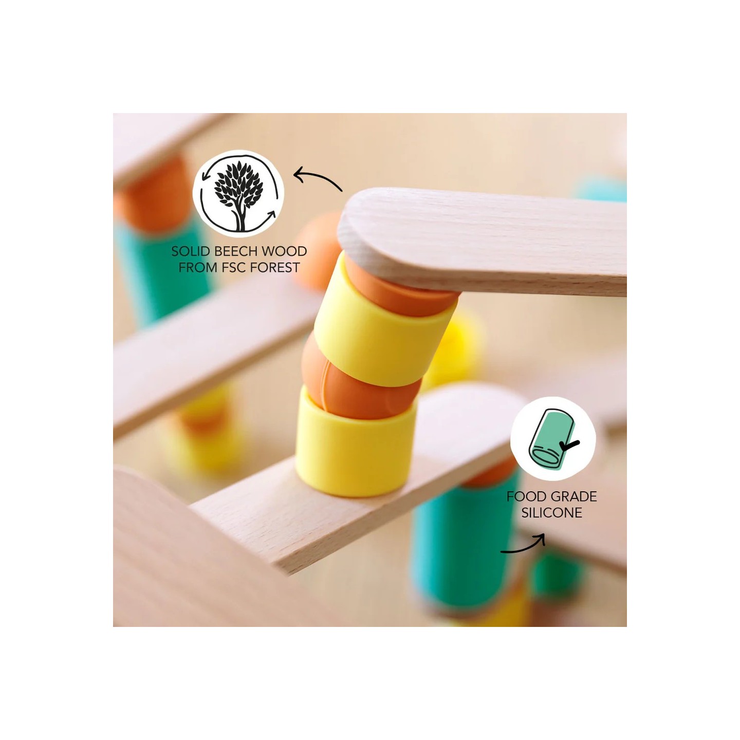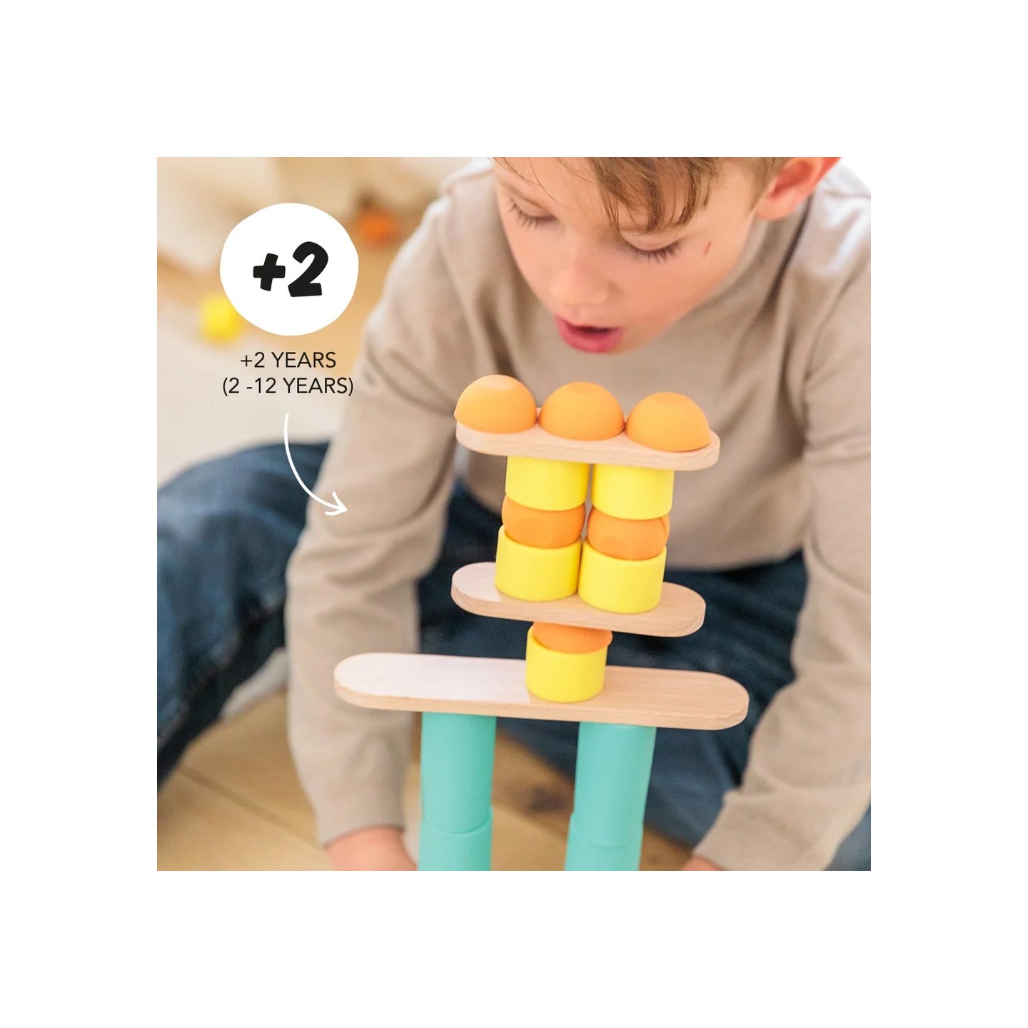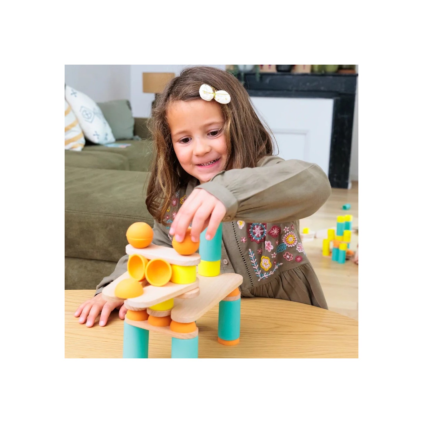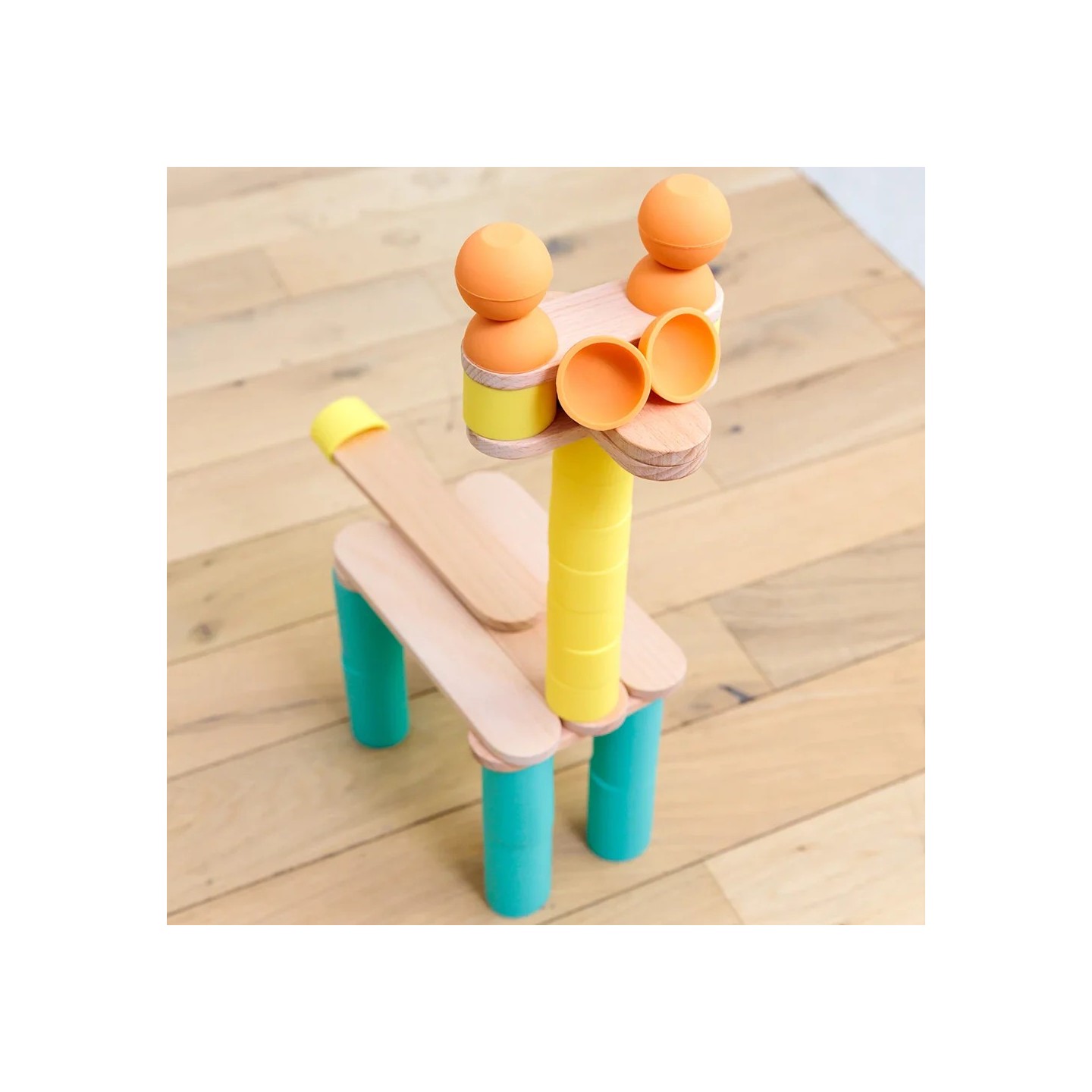 Kit de base 60 pièces : 20 demi-sphères (silicone), 20 tubes en silicone, 20 planchettes en bois + un livret d’inspiration.