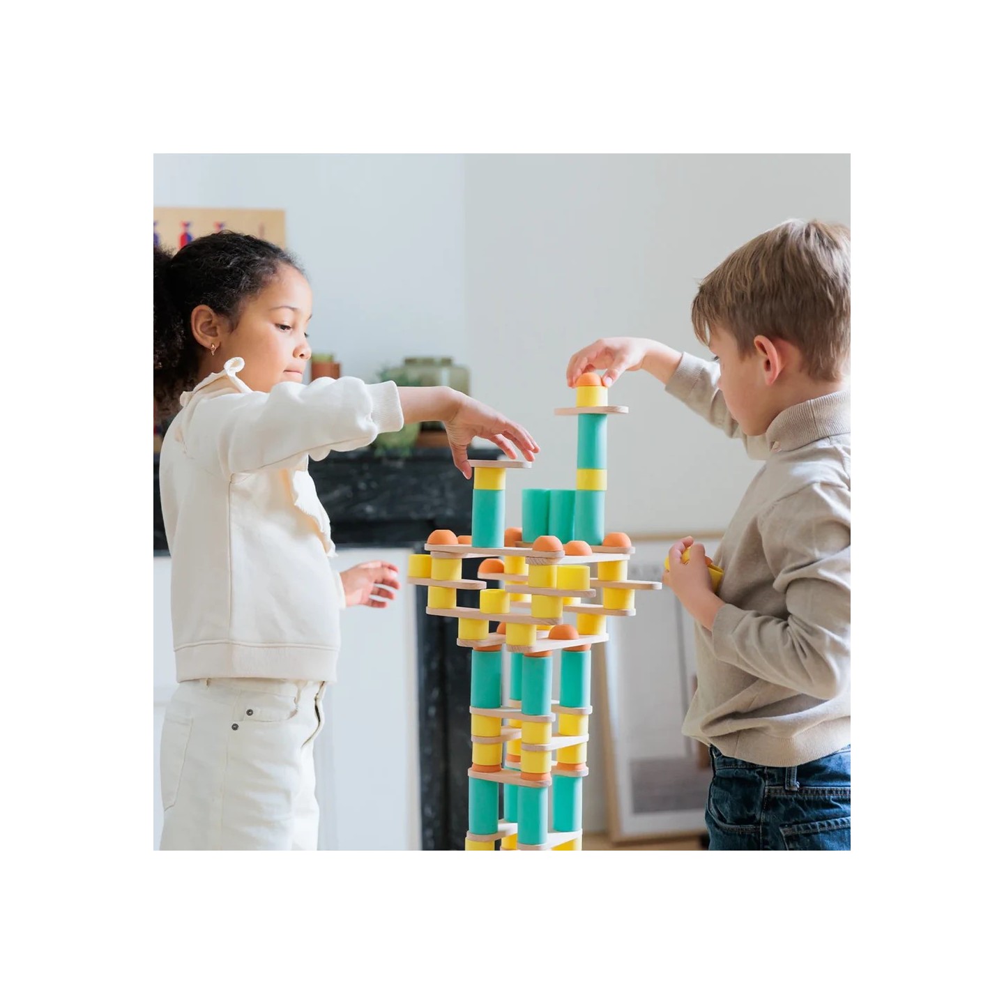 Bataille de Stix : jouer à deux pour poser des planchettes de chaque côté d’un tube et tester l’équilibre.