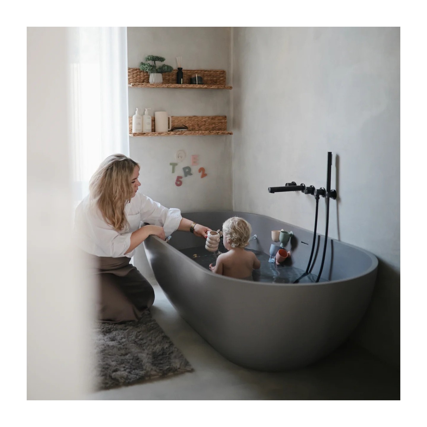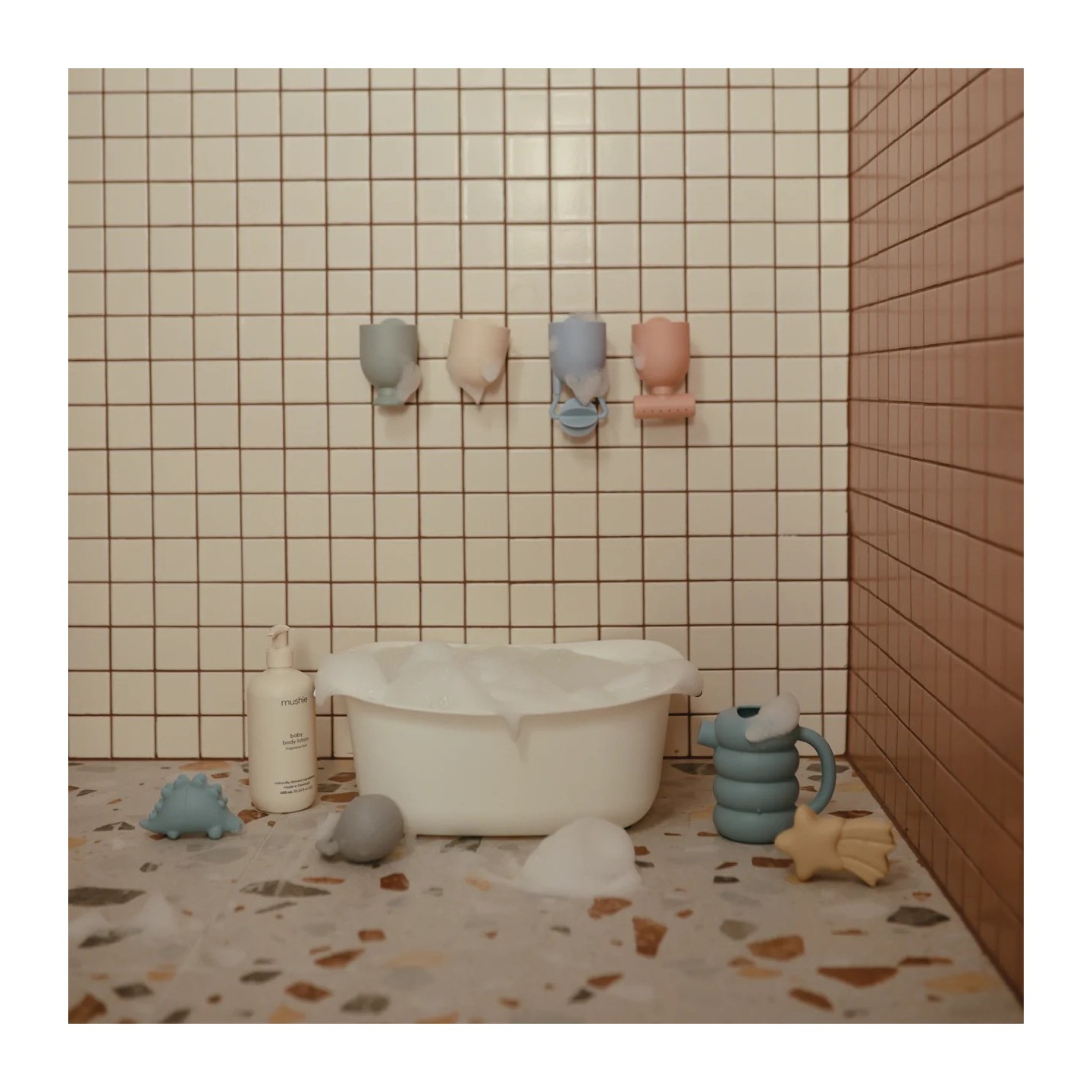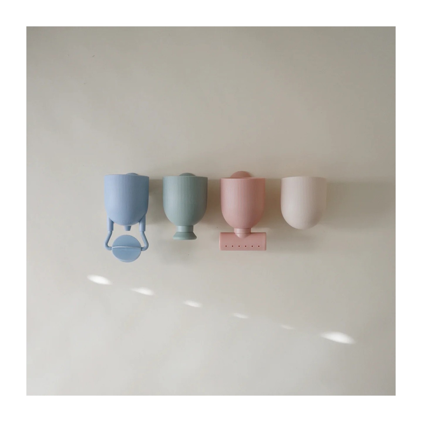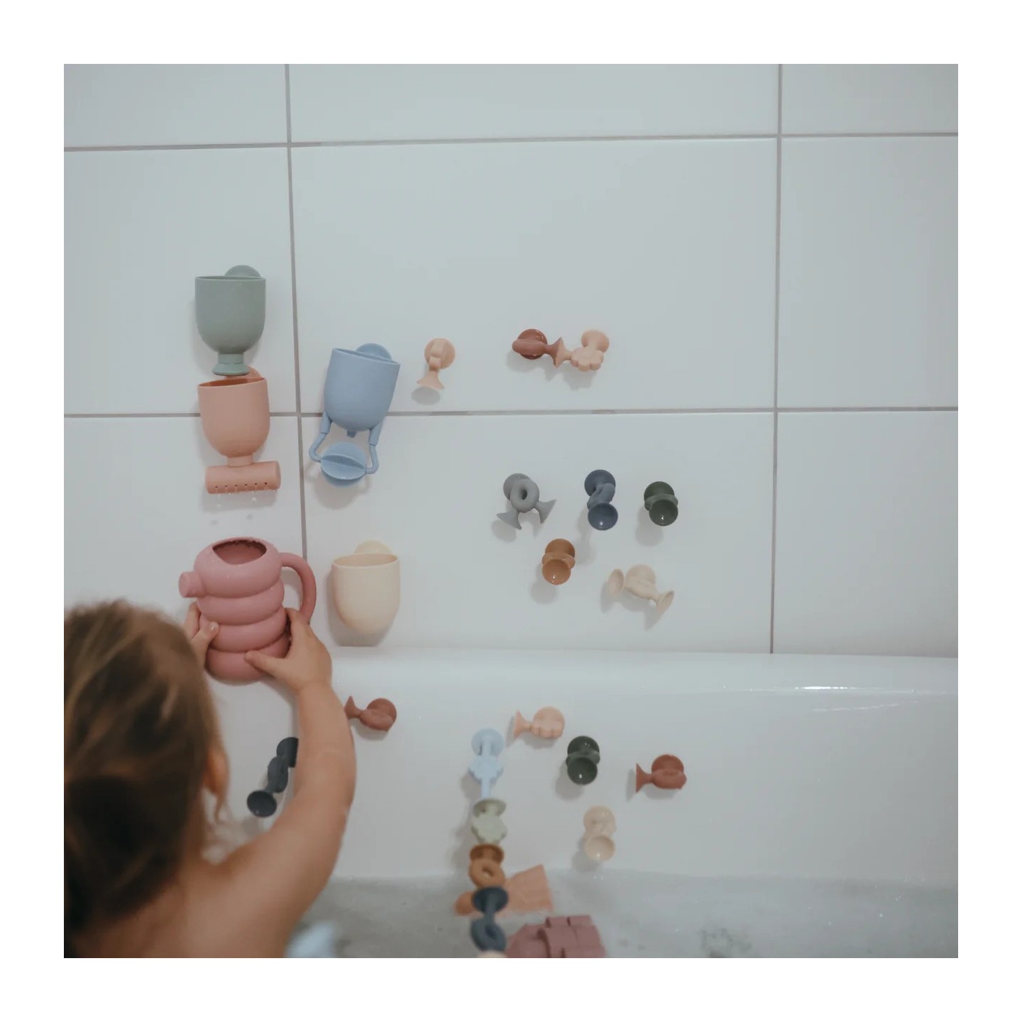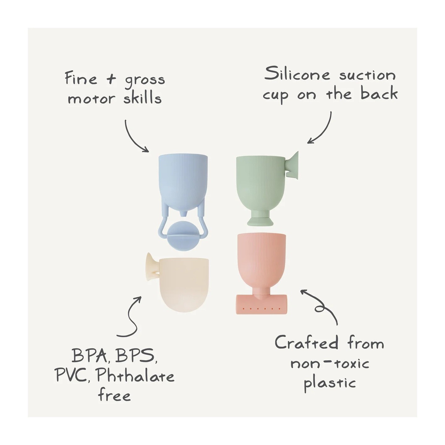 Fixation ludique et pratique — Chaque gobelet est équipé d’une ventouse en silicone à l’arrière, permettant à l’enfant (ou aux parents) de les coller sur les parois de la baignoire et de créer des cascades d’eau personnalisées.