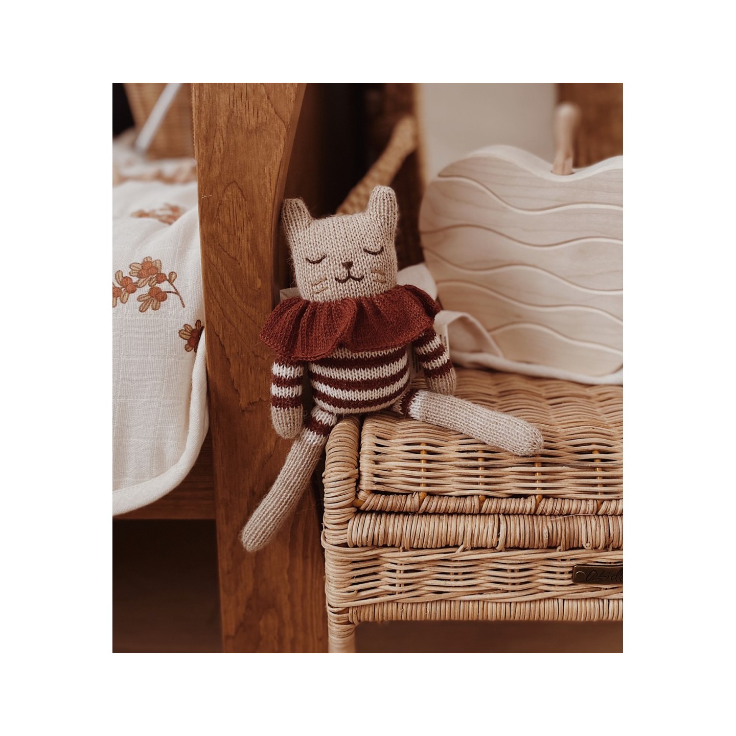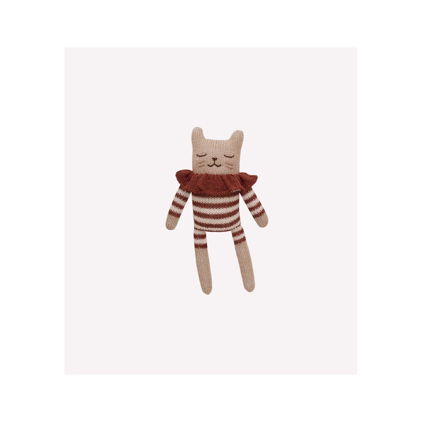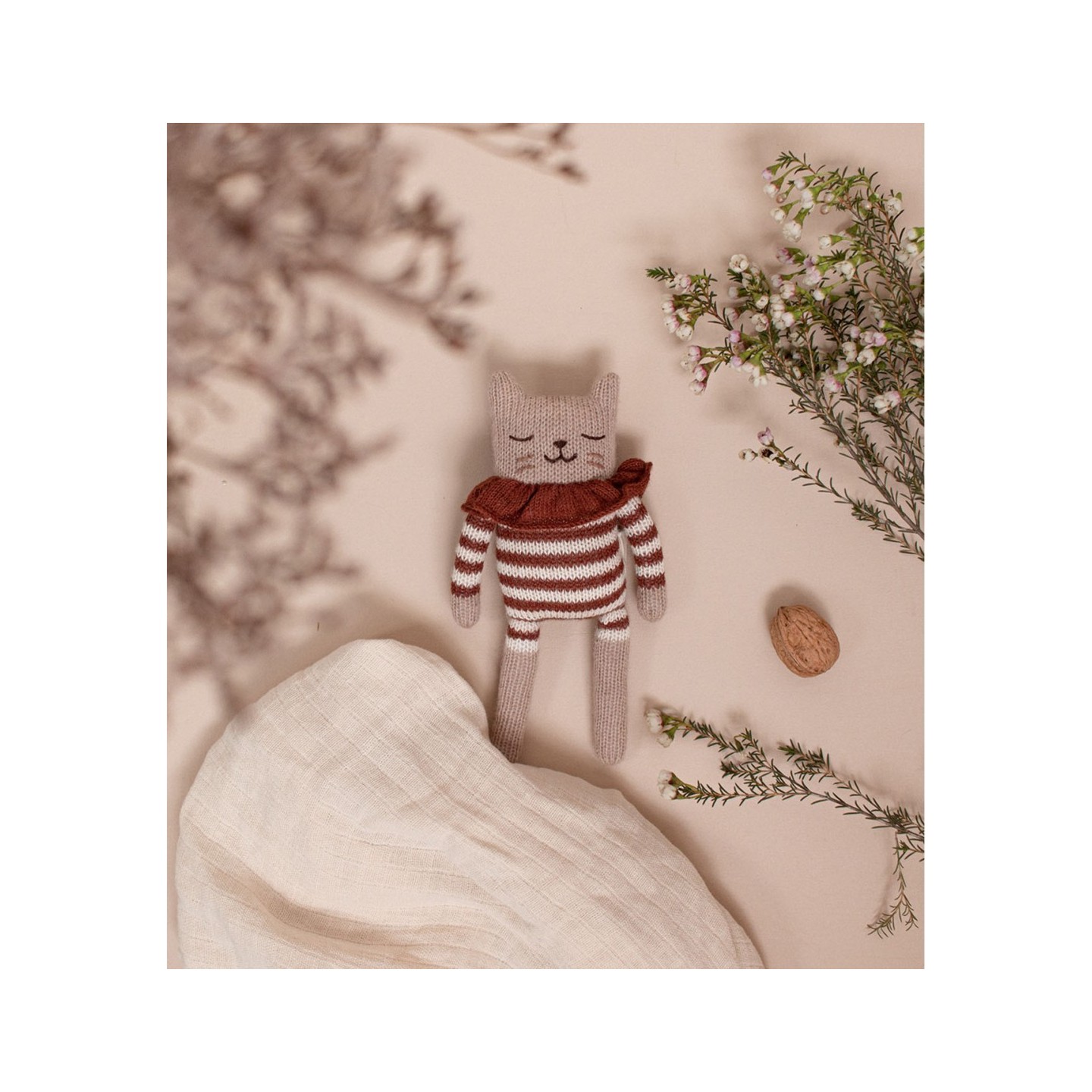 Le Doudou Chaton | Combishort Rayé Sienne est un petit compagnon tout doux, tricoté à la main, imaginé pour accompagner les bébés dès la naissance. Avec sa combinaison rayée couleur sienne et son petit col — un détail charmant — ce chaton en laine apporte une touche tendre et douce à l’heure des câlins, des siestes ou du sommeil.