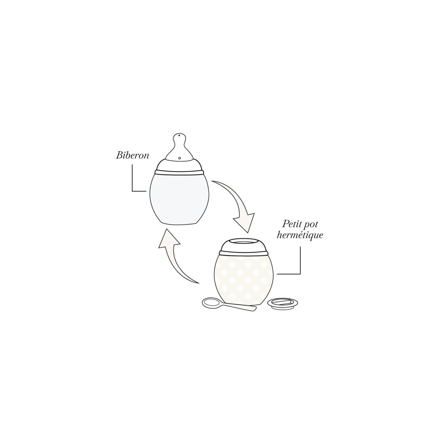 • Biberon évolutif qui se transforme en petit pot grâce à l'opercule fourni dans la boîte du biberon puis en tasse d'apprentissage avec les becs de succion (vendus séparément).