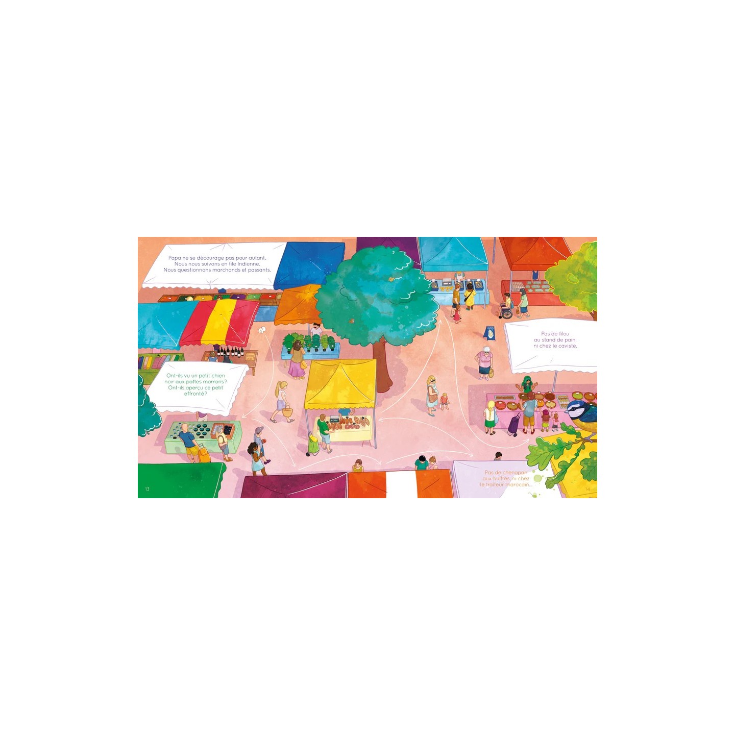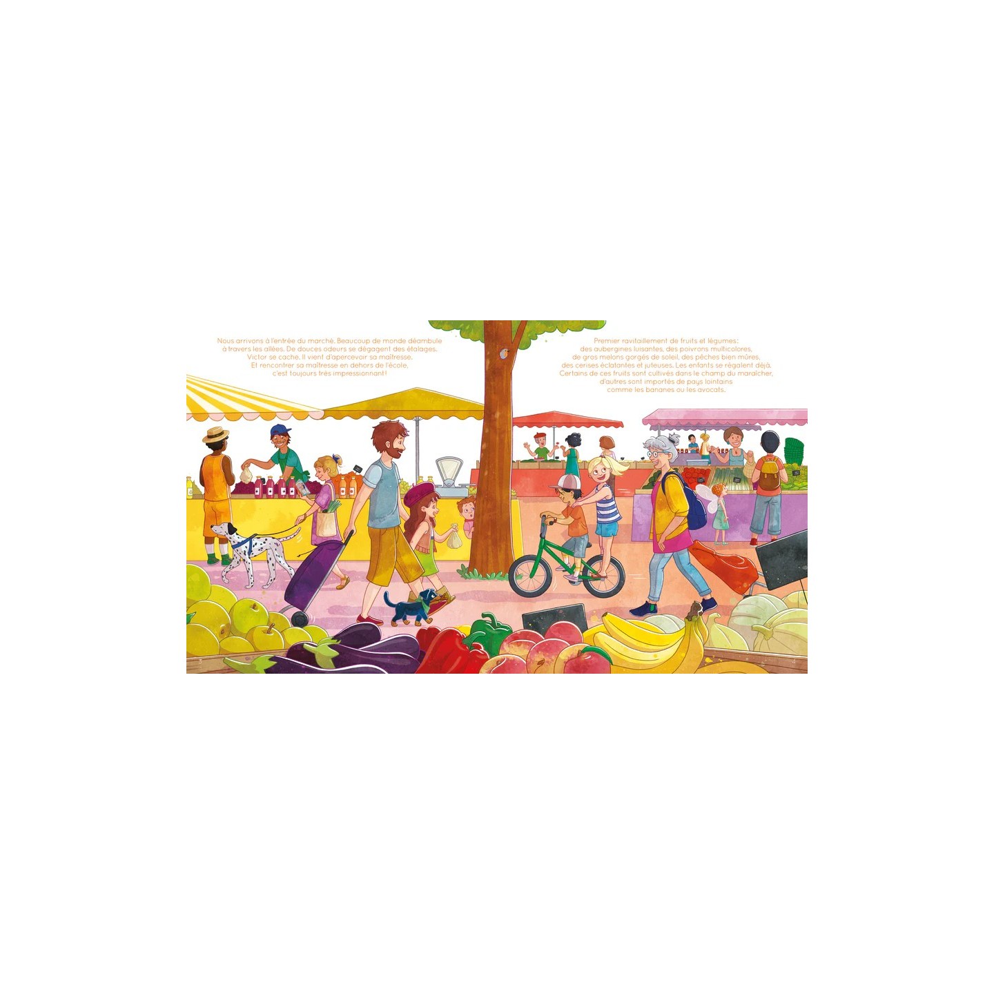 L’histoire en bref : Victor et sa sœur Juliette partent au marché acheter leurs provisions pour la semaine. Ils rencontrent aux fils des allées des producteurs passionnés et talentueux. La fromagère, l’apiculteur, la marchande de fraise… Quand soudain, au détour d’une allée, ils perdent leur petit chien. C’est le début de la course infernale. Ils demandent à marchands et passants où peut bien être allé ce petit chenapan.