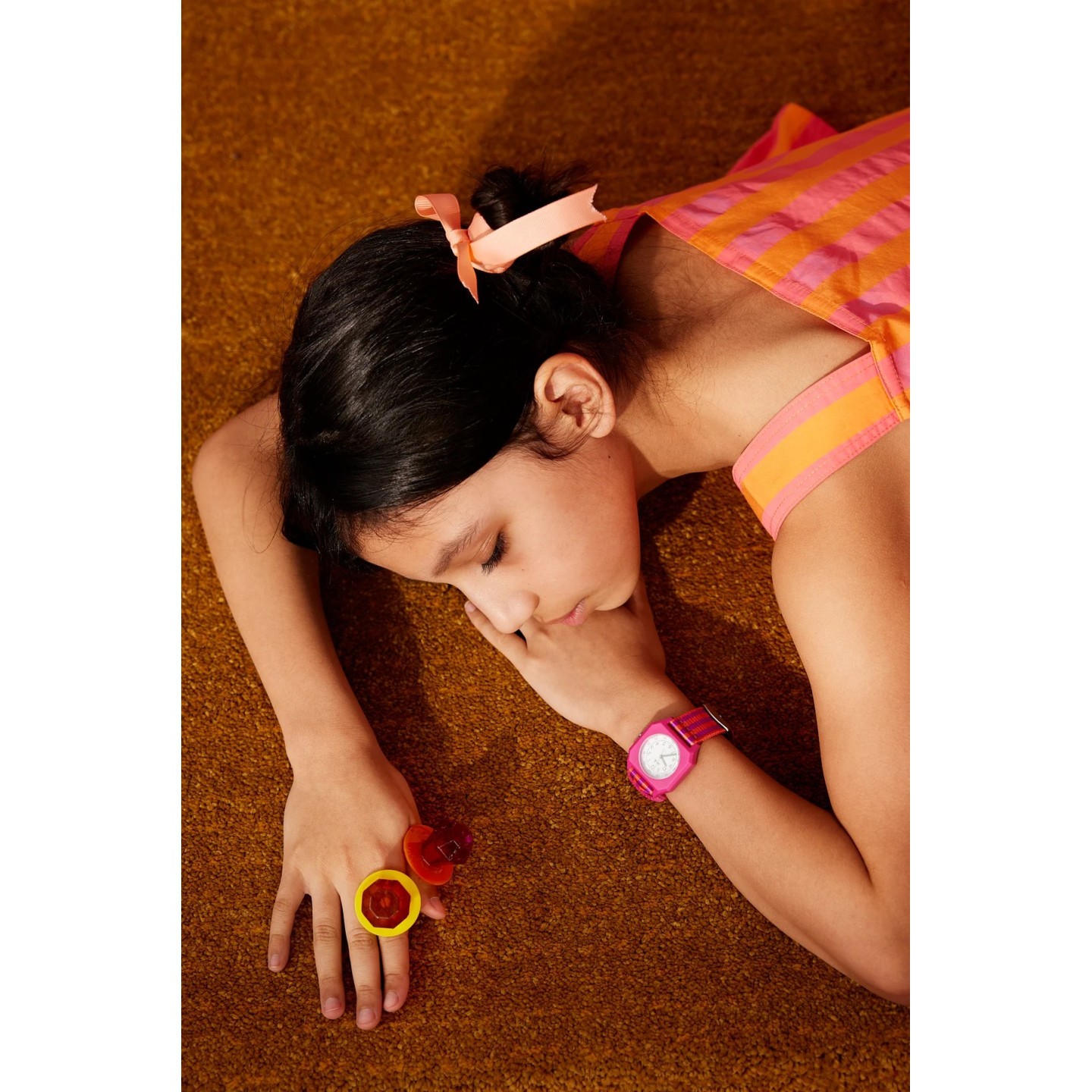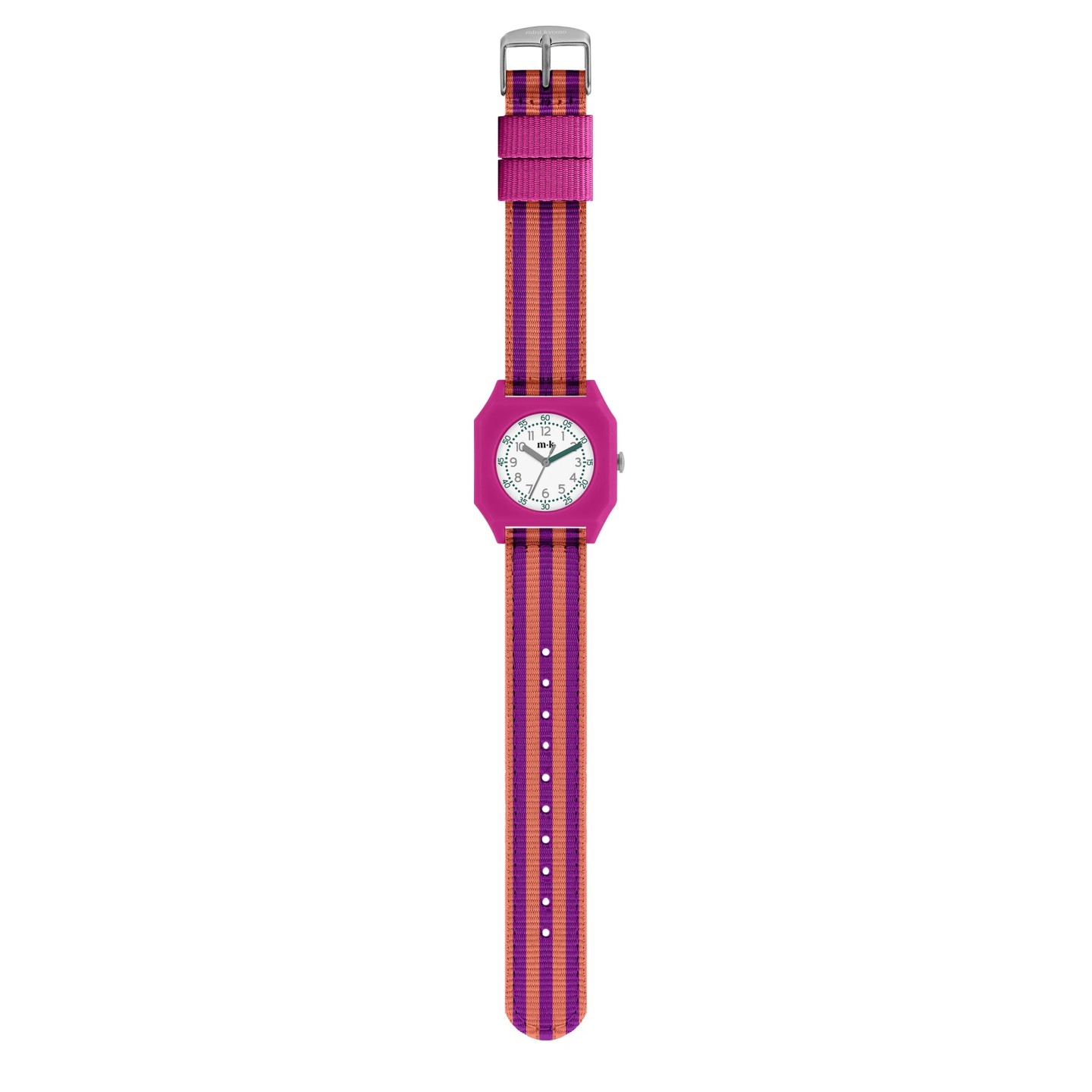 La montre Ruby Papaya de la marque Mini Kyomo explore un univers ludique et coloré : un boîtier fuchsia/papaye, un bracelet à rayures multicolores, pour un résultat vibrant et plein de vie. Elle fait partie de la collection STRIPES de la marque.