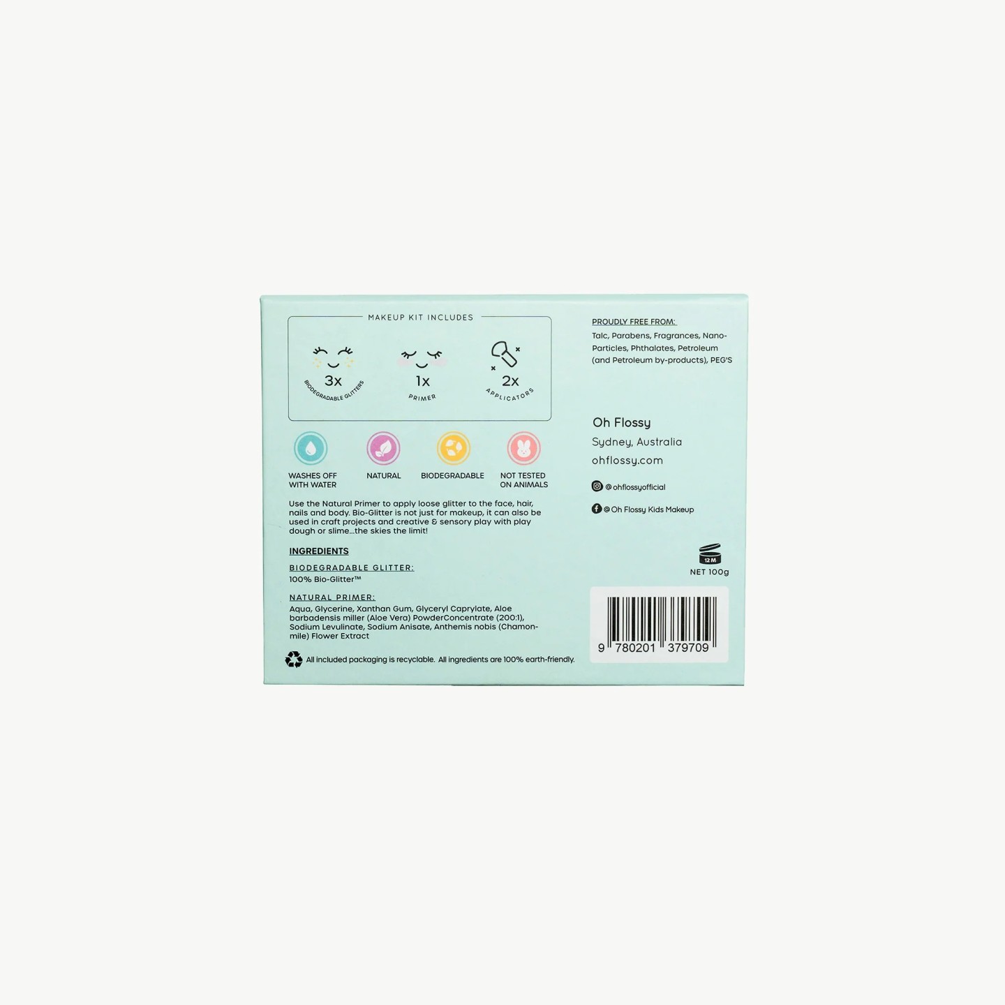 Ce magnifique coffret « Sparkly Glitter Set » de la marque Oh Flossy invite les enfants à briller de mille feux : trois paillettes (rose, opale/vert clair, or) biodégradables, une base d’adhésion (« primer ») naturelle, et deux applicateurs pour s’amuser avec visage, cheveux, corps ou ongles. Le tout présenté dans une superbe boîte à fermeture magnétique conçue par l’artiste Rosa Ronco. L’usage va au-delà du maquillage : le glitter peut aussi servir pour des jeux créatifs, du slime, des activités artistiques