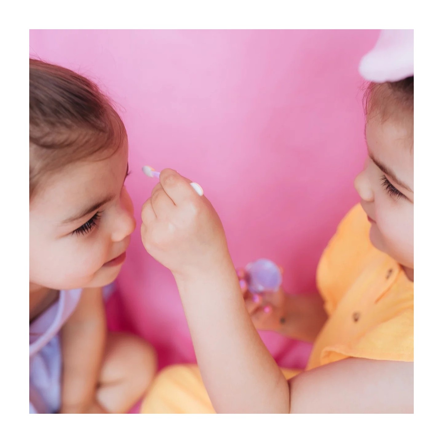 Les couleurs sont douces, colorées et chatoyantes (fards irisées, blush, rouge à lèvres) et conçues pour un usage ludique. Le tout s’enlève facilement à l’eau, sans frottement agressif ni produits chimiques durs.