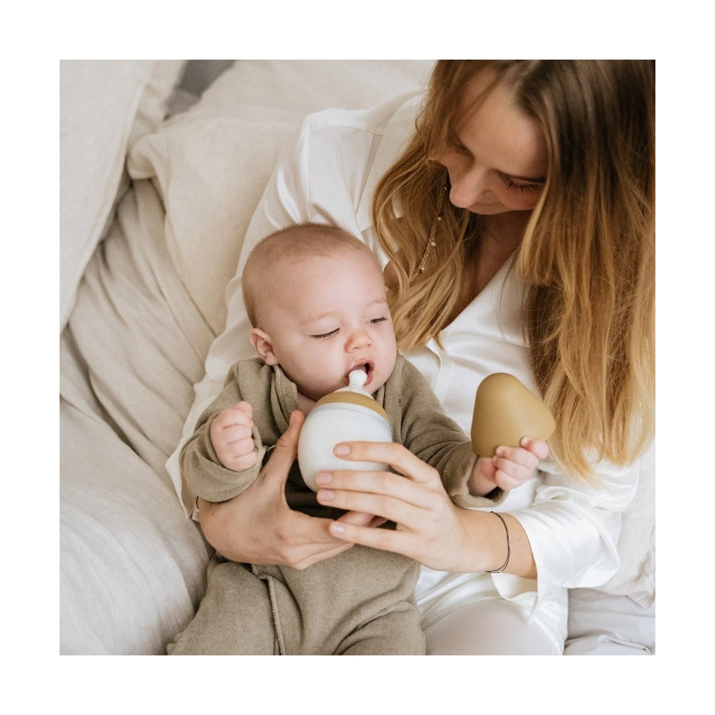 Les Biberons Elhée sont en silicone et sont dotés d'un principe unique et ingénieux: le lait n'entre jamais en contact avec des matériaux autres que ceux de la bouteille ou de la tétine en silicone.